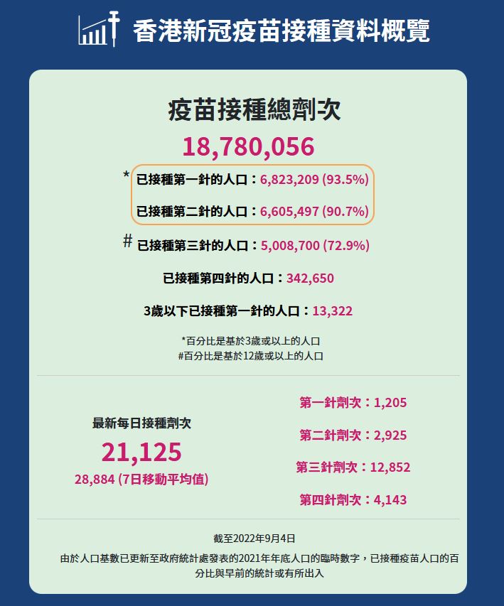 即時熱點 新冠疫苗接種|已接種第三針人口達72.9% (20:12) 發佈於 3 年 前 2022 年 9 月 4 日 By 明報 截至2022年9月4日,香港新型冠狀病毒疫苗接種總劑次:資料來源:www.covidvaccine.gov.hk/zh-HK 相關文章:打針圖表新冠疫情新冠疫苗編輯推介 Up Next 新冠疫情|9月4日染疫數字圖表 (19:45) 不要錯過 天氣|天文台料周一天晴乾燥酷熱 中秋節短暫時間有陽光 (20:00) 繼續閱讀 贊助商 猜你喜歡 FDA內部備忘:美10童疑死於「新冠疫苗相關」心肌炎 免針紙案 蔡淑梅夫否認圖轉移資產 稱妻「奉公守法」 酒吧黑幫謀殺案開審 一被告稱僅掟樽無殺人 內地便利入境旅遊 冀追回疫情失地 控「虛假信息損國家形象」 張展再判囚4年 打科興胸痛不治 男子裁死於自然