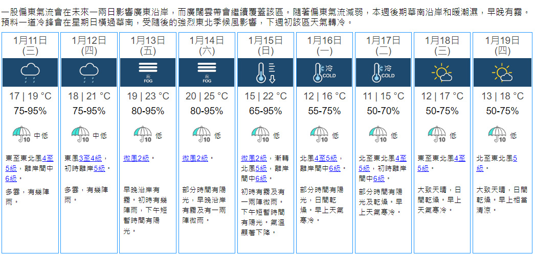 即時熱點 天氣|周三料17℃-19℃有幾陣雨 下周北風增強氣溫降至11℃ (21:00) 發佈於 3 年 前 2023 年 1 月 10 日 By 明報 【21:00】本港地區今晚(10日)及明日(11日)天氣預測:多雲,有幾陣雨,氣溫介乎17℃至19℃。吹和緩至清勁東至東北風,明日離岸間中吹強風。展望周四仍有幾陣雨。本周後期和暖潮濕,早晚沿岸有霧。周日北風增強,氣溫顯著下降,九天天氣預報顯示,下周二(17日)氣溫跌至11℃。 【08:37】上午8時半,天文台錄得18.5℃,相對濕度91%。本港地區今日天氣預測多雲,有幾陣雨,最高氣溫約21℃。吹和緩東至東北風,稍後離岸風勢清勁。 (天文台) 相關文章:天文台天氣速遞編輯推介 Up Next 短片:內地傳統花饃造型多變迎新春【多圖】 (18:01) 不要錯過 綠領行動免費派重用利市封 51地點可領取 (18:38) 繼續閱讀 贊助商 猜你喜歡 天氣|天文台:非常乾燥 日間最高22°C (08:47) 「天琴」橫行南海 黃岩島大暴雨 (01:43) 天氣|天文台:非常乾燥最高23°C 明早市區降至約15°C (08:24) 天氣|天文台:周四天晴非常乾燥 市區最低17°C (21:11) 天氣|天文台:本港今早較昨日低兩至三度 日間非常乾燥 (08:23) 天氣|天文台:周三天晴非常乾燥 早上清涼市區最低17°C (20:58)
