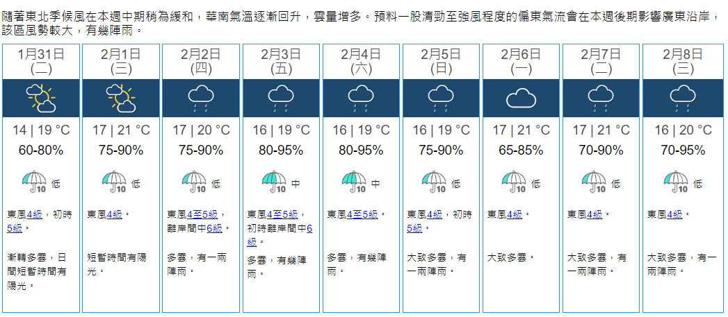 【21:45】本港地區今晚(30日)及明日(31日)天氣預測:晚間漸轉多雲,明日日間短暫時間有陽光。氣溫介乎14°C至19°C。吹和緩偏東風,初時風勢清勁。展望周三氣溫進一步回升,短暫時間有陽光。隨後一兩日風勢較大,有幾陣雨。