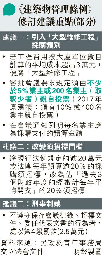 據民政及青年事務局向立法會提交文件,政府建議《建管條例》加入新採購類別,若工程費用按大廈單位數目計算的平均成本逾3萬元,便屬「大型維修工程」。現時《建管條例》規定法團業主大會的法定人數須為業主人數的10%,業主可親自或透過委派代表出席會議,政府建議加入要求,表決上述項目時須有不少於5%業主或200名業主「親自投票」。