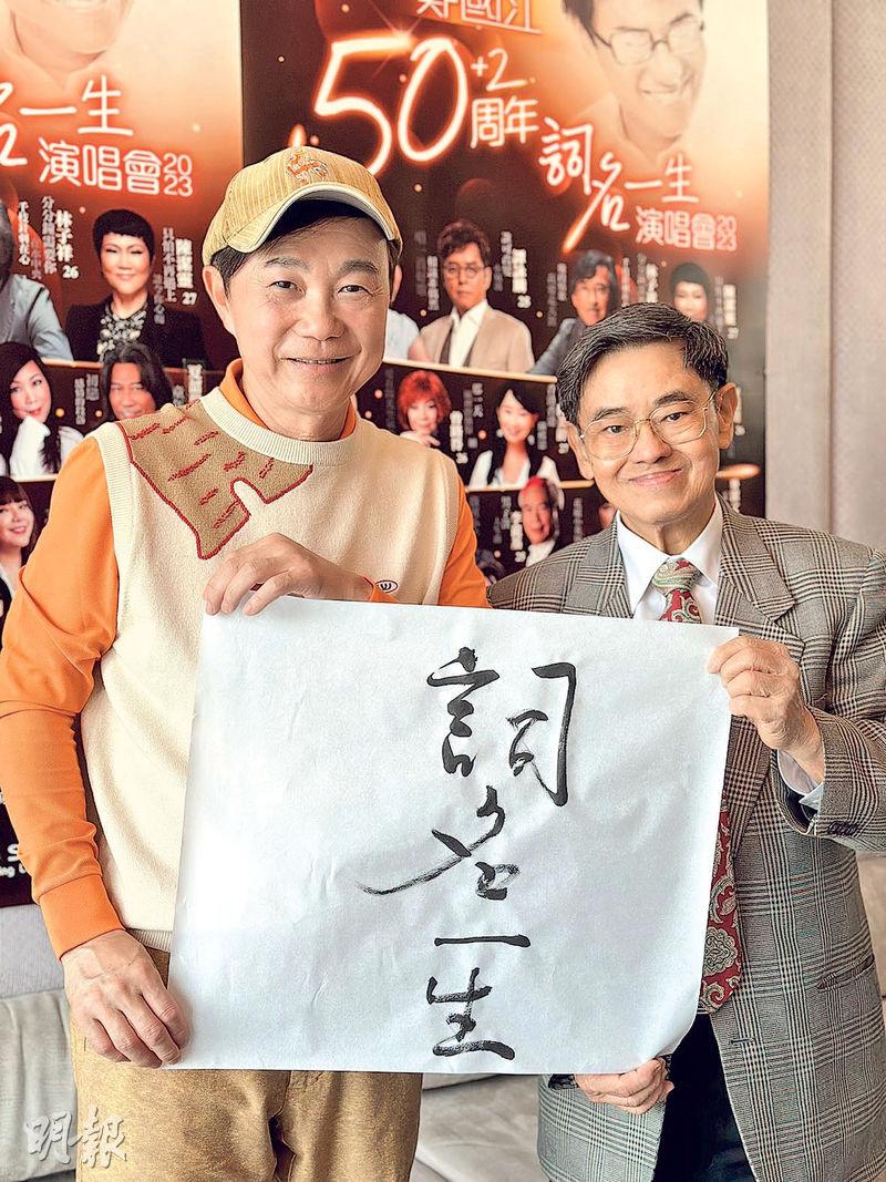 【明報專訊】82歲著名填詞人鄭國江將於5月假伊利沙伯體育館舉行3場《鄭國江50+2周年詞名一生演唱會》,他昨日聯同區瑞強出席記者會。鄭國江近年醉心書法,書法初哥的區瑞強在鄭國江指導下寫「詞名一生」,獲讚寫得不錯。演唱會邀得譚詠麟(阿倫)、林子祥(Lam)、陳潔靈和張德蘭等擔任嘉賓,唱出由鄭國江為他們填詞的經典金曲,亦會重溫已故張國榮、陳百強及梅艷芳的歌曲,由其他歌手演繹,最尾會大合唱。鄭國江多謝阿倫與Lam一口答應演出,無以為報。