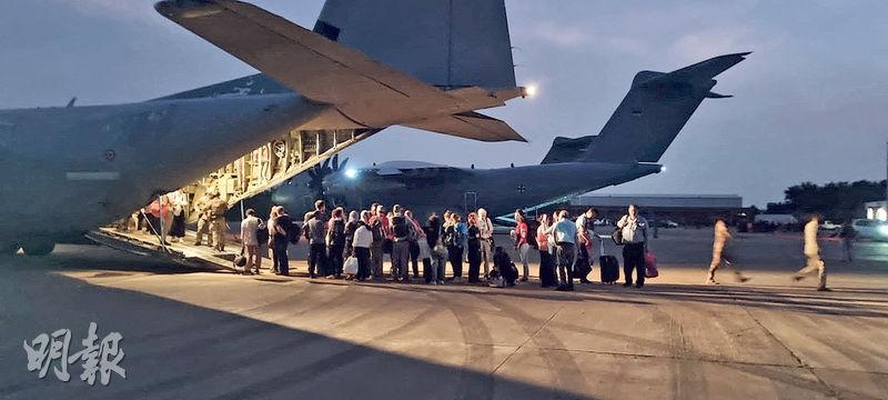 美軍3架MH-47「奇努克」(Chinook)直升機上周六載着特種部隊成員,從近1300公里外的東非國家吉布提飛到喀土穆,周日凌晨撤走美國駐當地大使館外交官和家屬,其間獲蘇丹政府軍和其對手「快速支援部隊」(RSF)承諾在使館附近暫時停火,撤離過程順利。美總統拜登表示,成功撤走少於100人,大部分為使館職員,美國大使館隨後關閉。幾小時後,聯合國一支載有職員和外國平民的車隊亦開始駛離喀土穆,前往蘇丹港,英法外交官則被護送至喀土穆市郊的機場,由軍用運輸機載走。