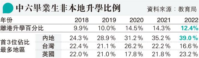 【明報專訊】教育局公布「2022年中六學生出路統計調查」,去年接受調查的41,222名中六畢業生,38,610名繼續讀全日制課程,其中12.4%離港升學,較2021年14.3%微跌。去年維持往內地升學佔比最高,達39%,且近年有上升趨勢。學友社學生輔導顧問吳寶城認為,近年內地升學政策方便學生,而海外升學者可能中六以前已舉家移民,故未反映在畢業生升學數據。