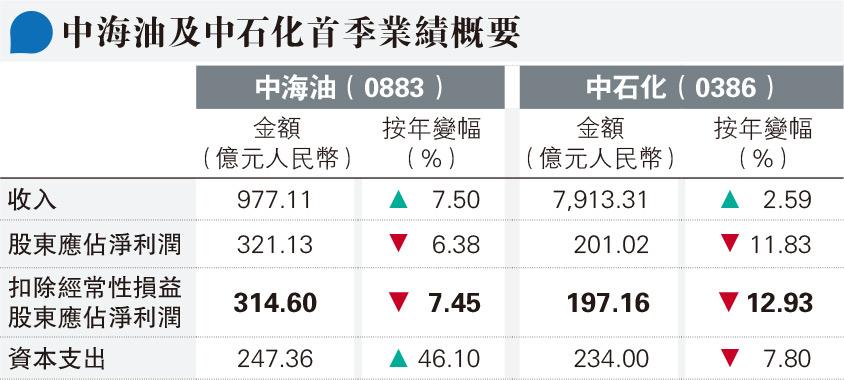 【明報專訊】中國海洋石油(下稱中海油)(0883)及中國石化(0386)昨日雙雙公布首季成績單,兩者的業績均見倒退。中海油季內的股東應佔淨利潤約321.13億元(人民幣,下同),按年下跌6.38%;中石化首季的淨利潤則跌11.83%,只賺201.02億元(見表)。