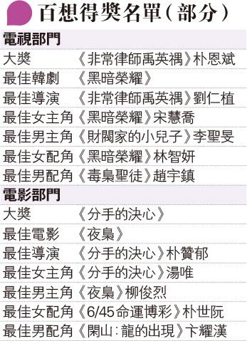娛樂 百想得獎名單(部分) 發佈於 3 年 前 2023 年 4 月 29 日 By 明報 【明報專訊】(請看附圖) 相關文章: Up Next 湯告魯斯占士高登合演《獅子王》 不要錯過 宋慧喬摘視后 朴恩斌奪大獎爆喊 《分手的決心》掃3獎大贏家 湯唯再登百想影后 繼續閱讀 贊助商 猜你喜歡