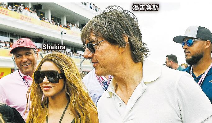 【明報專訊】《壯志凌雲:獨行俠》60歲男星湯告魯斯(Tom Cruise)日前現身邁阿密F1賽車場,巧遇身在當地的《狂野時速》主角雲狄素(Vin Diesel)與拉丁天后Shakira,湯佬分別跟他倆合照,隨即在社交媒體瘋傳。據美媒Page Six報道,湯佬對比他年輕14歲、去年跟球星碧基分手的Shakira甚有好感,事後送花展開追求攻勢,「兩人好像產生化學作用」,該報道如是說。