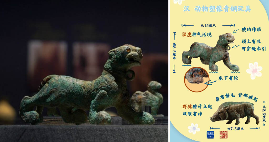 ‧動物青銅玩具:一套四件,其中猛虎玩具腳爪下有細輪、頸前有孔可串繩牽引。來自南昌漢代海昏侯國遺址,於海昏侯劉賀長子劉充國之墓出土,南昌漢代海昏侯國遺址博物館副館長介紹青銅材質象徵王子的尊貴身分。