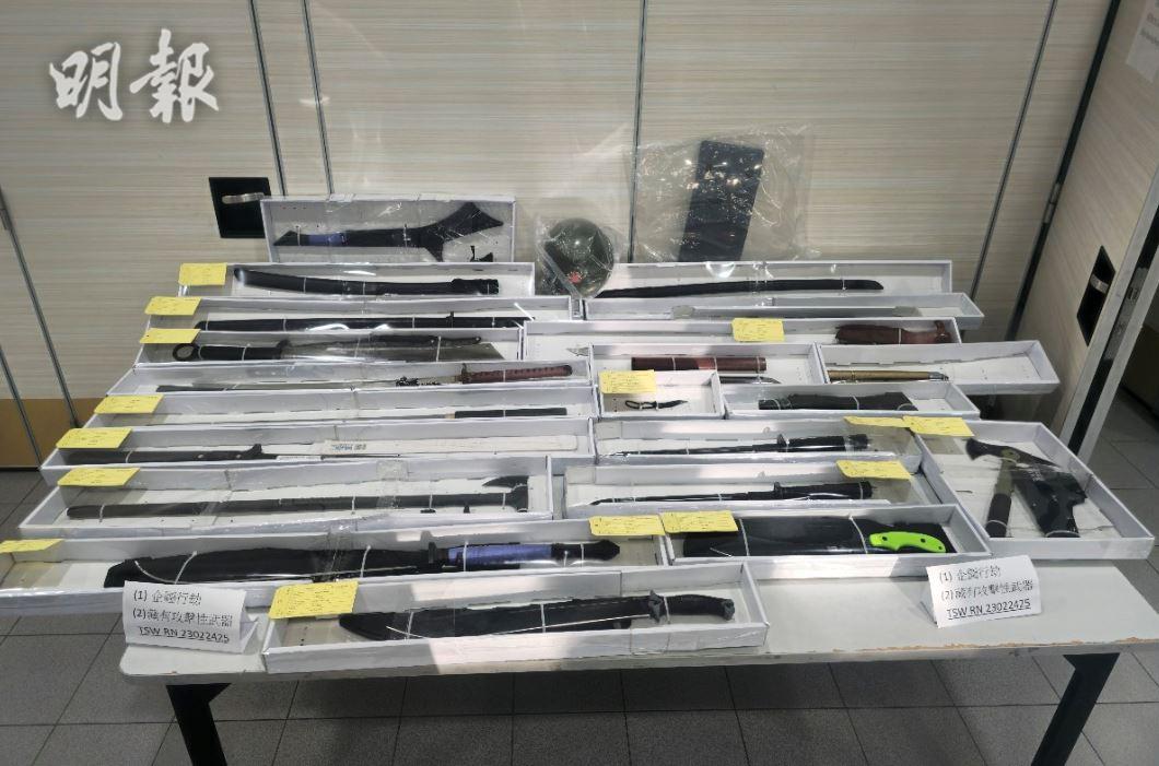 元朗警區總督察(刑事)戴玉麟指,警員拘捕疑犯時,在其家中搜到案發時衣服及開山刀,以及大量武器,包括軍刀、日本刀、斧頭。該批武器被隨意擺放在住所内,警方正調查武器來源。涉案男子報稱在五金工場工作,警方指暫時未有證據顯示有黑社會背景,或精神病記錄。