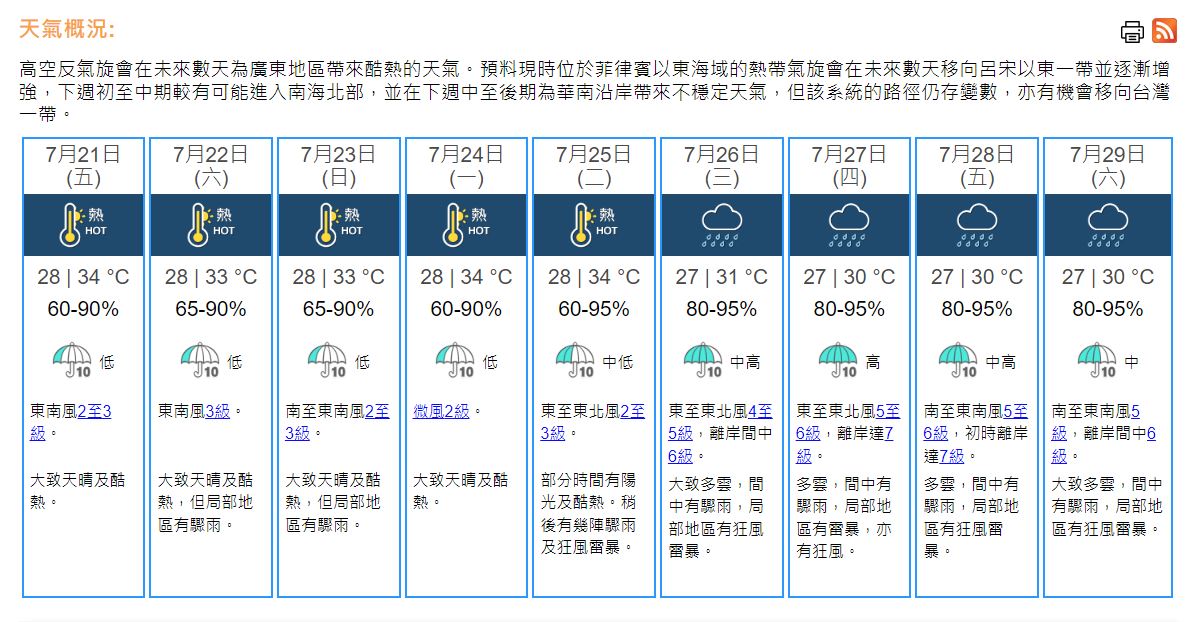 即時熱點 天氣|天文台:天晴酷熱 市區最高氣溫34度 (08:43) 發佈於 2 年 前 2023 年 7 月 21 日 By 明報 上午8時20分,天文台錄得28.6°C,相對濕度87%。 高空反氣旋正為廣東帶來普遍晴朗的天氣。在上午8時,位於菲律賓以東海域的熱帶低氣壓集結在馬尼拉以東約1260公里,預料向西北偏西移動,時速約10公里,橫過菲律賓以東海域。 本港地區今日(21日)天氣預測大致天晴及酷熱。市區最高氣溫約34度,新界再高一兩度。吹輕微至和緩東南風。展望未來數日持續酷熱,大致天晴,但局部地區有驟雨。下周中期天氣漸轉不穩定。(天文台) 相關文章:天文台天氣天氣速遞編輯推介 Up Next 短片:伊朗古城千年捕風塔 古代建築智慧能散熱降溫 (18:50) 不要錯過 沖凍水涼消暑或易感冒 中醫教路:先暖水後凍水勿「照頭淋」 (11:56) 繼續閱讀 贊助商 猜你喜歡 【Emily】霜凍警告連發 粉嶺植物結霜 天文台:今早市區11、12°C 新界部分地區降至7°C左右 (08:10) 天氣|天文台:今早市區11、12°C 新界部分地區降至7°C左右 (08:10) 天氣|天文台:周五天晴非常乾燥 市區最低12°C (22:04) 天文台:相對濕度今午曾降至17% 1984年以來1月最低紀錄 (17:11) 天文台再發霜凍警告 料新界內陸周五早上或現地面霜 (16:36)