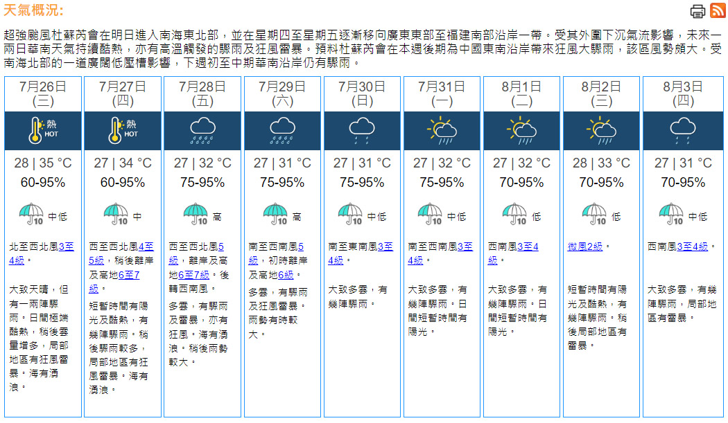 【20:50更新】本港地區今晚(25日)及明日(26日)天氣預測:大致天晴,有一兩陣驟雨,明早最低氣溫約28°C,日間極端酷熱,市區最高氣溫約35°C,新界再高一兩度。稍後雲量增多,局部地區有狂風雷暴。海有湧浪。吹微風,明日轉吹和緩北至西北風。展望周四仍然酷熱,稍後驟雨逐漸增多,風勢有所增強,海有湧浪。周五及周六有狂風大驟雨,風勢頗大。[周三稍後發一號戒備信號]