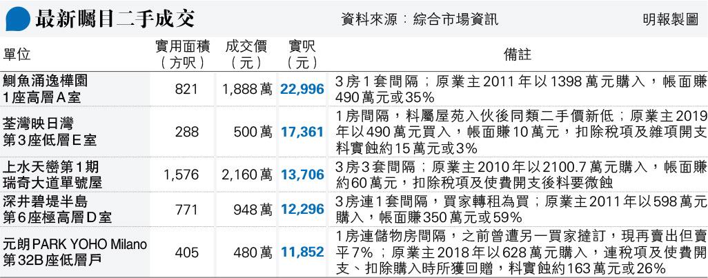 暑假租務旺季下,個別人士卻轉租為買;中原副分區營業經理蔡健民指,深井碧堤半島第6座極高層D室,實用771方呎3房1套戶,以948萬元售出、實呎12,296元,新買家為區內租客,見住宅租金續升而拍板入市;原業主2011年以598萬元買入,帳面賺350萬元或59%。另美聯首席高級營業經理蔡玉峰指,鰂魚涌逸樺園第1座高層A室,實用821方呎3房1套戶,以1888萬元售出、實呎22,996元;原業主2011年約1398萬元購入,帳面賺490萬元或35%。