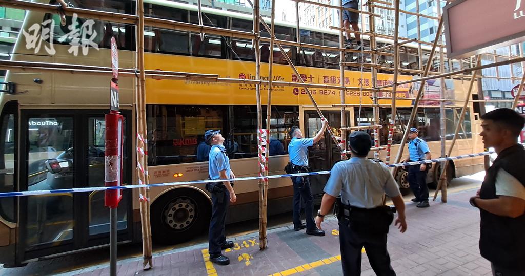 九巴途經旺角新興大廈遭石屎擊穿車頂 無人受傷 警拘工程負責人 (16:03)