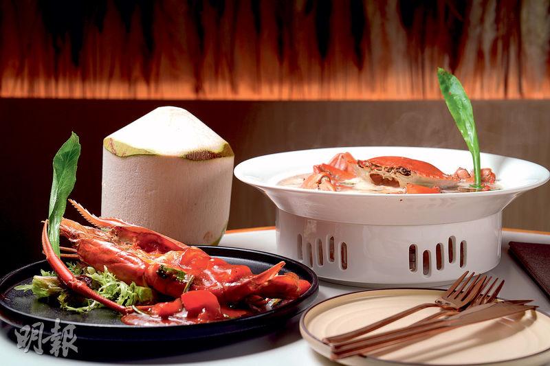 近日氣溫高企,加上經常下雨,又熱又濕,最適合品嘗清爽的水產。越南海鮮河鮮多不勝數,當中以肉蟹和大頭蝦最著名,Chill Vietnam Cuisine & Bar亦力推招牌菜——越式椰青蒸肉蟹。他們嚴選1斤4両重的新鮮越南肉蟹,用上足4個椰青的椰肉和椰水,加入蛋白和月桂葉原隻蒸半小時,上菜前再撒上幾片越南地道香草鵝帝,其近似芫荽的清爽香氣有助提鮮。肉蟹肉質結實嫩滑,果然沒讓人失望;但叫人更驚喜的是鮮甜無比的蟹湯,滿滿的蟹肉鮮味精華帶有濃濃的椰子清香,甜而不膩,忍不住喝了兩大碗。
