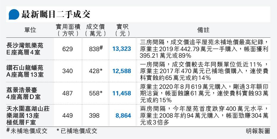 不過,新晉市區居屋長沙灣凱樂苑卻錄高價成交。中原地產高級分行經理吳家俊表示,凱樂苑E座高層4室,實用面積629方呎,屬原裝清水單位,可作3房1套間隔,望開揚市景,最初開價900萬元,以綠表價838萬元易手,實呎13,323元。資料顯示,是次追平屋苑一個同面積單位今年1月創下之最高成交價紀錄。最新易手單位的原業主,2019年10月442.79萬元向房委會一手購入,持貨近4年,帳面獲利395.21萬元或89%。