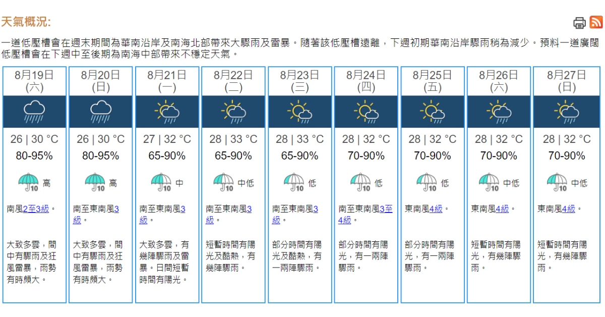 【20:25】一道低壓槽正為廣東沿岸及南海北部帶來驟雨及雷暴。天文台預測本港地區今晚(18日)及明日(19日)大致多雲,有幾陣驟雨及狂風雷暴。明日驟雨較多,雨勢有時頗大。氣溫介乎26至30°C。吹輕微至和緩偏南風。展望周日(20日)間中有大驟雨及狂風雷暴。隨後兩三日仍有幾陣驟雨,短暫時間有陽光。(天文台)