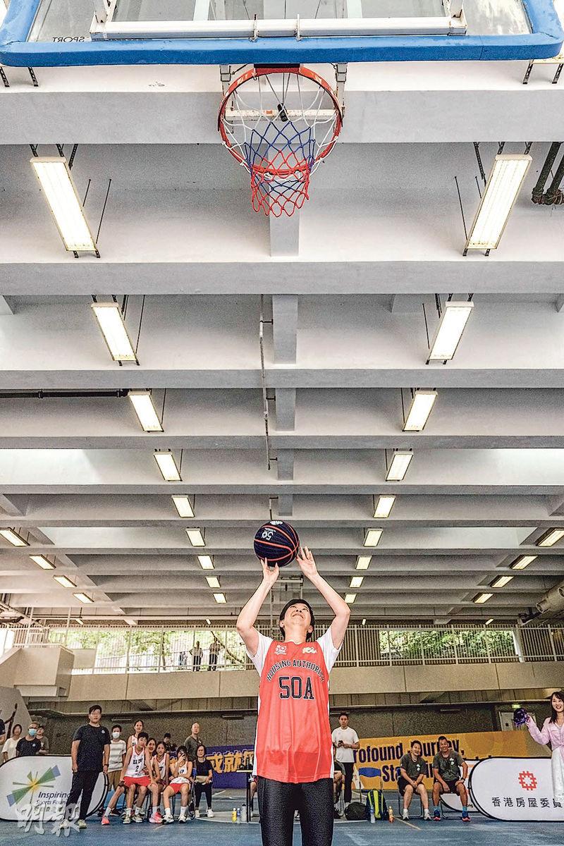 何永賢同其他官員一身波衫波鞋,羅淑佩去到充氣籃球面前「打卡」,動作多多。何永賢、戴尚誠同年輕球員一齊射籃,每人有兩次機會,年輕球員開頭一球都唔入,輪到何永賢,好易就入咗一球,戴尚誠都有一球進帳,主持人笑笑口話要靠局長嚟追分。