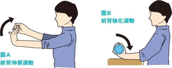 前臂肌肉強化運動則需要一個啞鈴,手握啞鈴,掌心向天,然後將前臂放在枱面上(如有需要,前臂可墊毛巾),保持前臂不動將手腕向上屈曲(圖B),15次為1組,做3組。兩運動雙手交替練習。