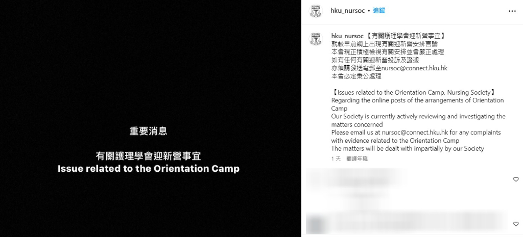主辦方港大護理學會上周六晚上於IG專頁發文回應稱,正積極檢視有關安排並會嚴正處理,呼籲如有任何投訴及證據可電郵該會,並強調必會秉公處理。