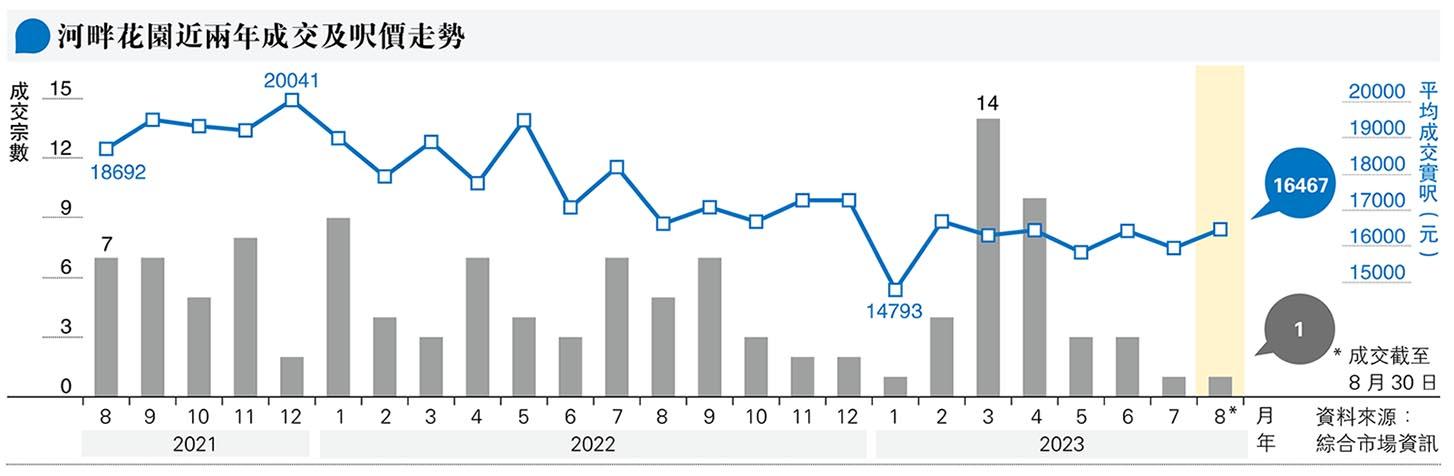 【明報專訊】新界區上車屋苑的樓價升勢一度相當凌厲,惟近年受加息陰霾、新供應增加影響,近日樓價可謂掉頭回落;沙田上車屋苑河畔花園,於旺市期間的平均實呎曾超越2萬元水平,但其後成交價隨大市低走,近月交投亦見疏落,連續兩個月均只有約1宗買賣成交,平均實呎約1.6萬元,而8月截至30日唯一成交,更屬蝕讓。