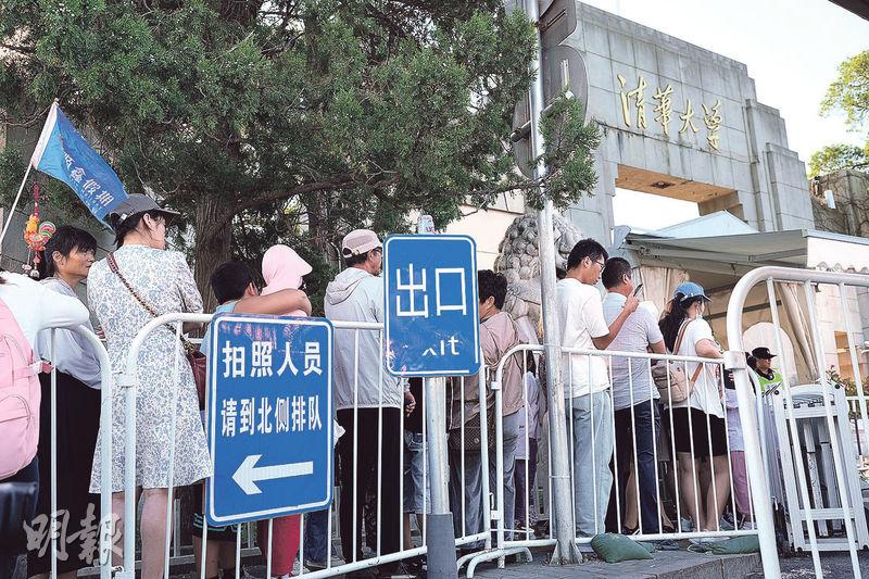 上月底的一個早上,記者7時許到清華大學西門外,已看到多輛旅遊巴陸續抵達,校方架設鐵馬讓遊客排隊與校門拍照,一大早人龍已有60、70人。由於並非個人參觀開放日,保安人員呼喝遊客「拍完照快走」,場面熱鬧。