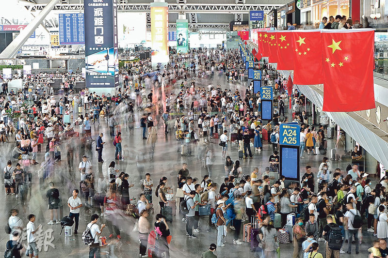 【明報專訊】內地即將進入連休8天的中秋、國慶假期。交通運輸部昨天(27日)表示,預計假期民眾出行意願強烈,全社會跨區域人員流動量達20.5億人次,假期首日全國高速公路流量可能突破歷史最高值。中國國家鐵路集團有限公司稱,鐵路國慶黃金周運輸昨啟動,為期12天,全國鐵路預計發送旅客1.9億人次,日均發送旅客1583萬人次。