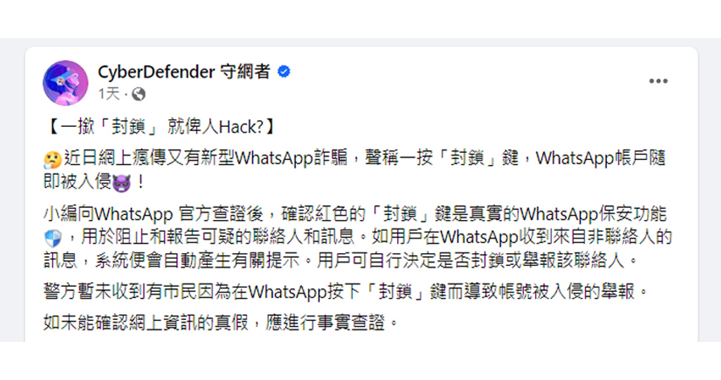 警方「守網者」facebook專頁表示,近日網上流傳有新型WhatsApp詐騙(聲稱在WhatsApp按「封鎖」鍵後帳戶會被入侵),警方向WhatsApp官方查證後,確認紅色「封鎖」鍵是真實WhatsApp保安功能。「守網者」續解釋,當WhatsApp用戶收到非聯絡人的信息,系統會自動產生「封鎖」提示,用戶可自行決定是否封鎖或舉報該聯絡人。WhatsApp/網絡防詐騙 實用資訊: