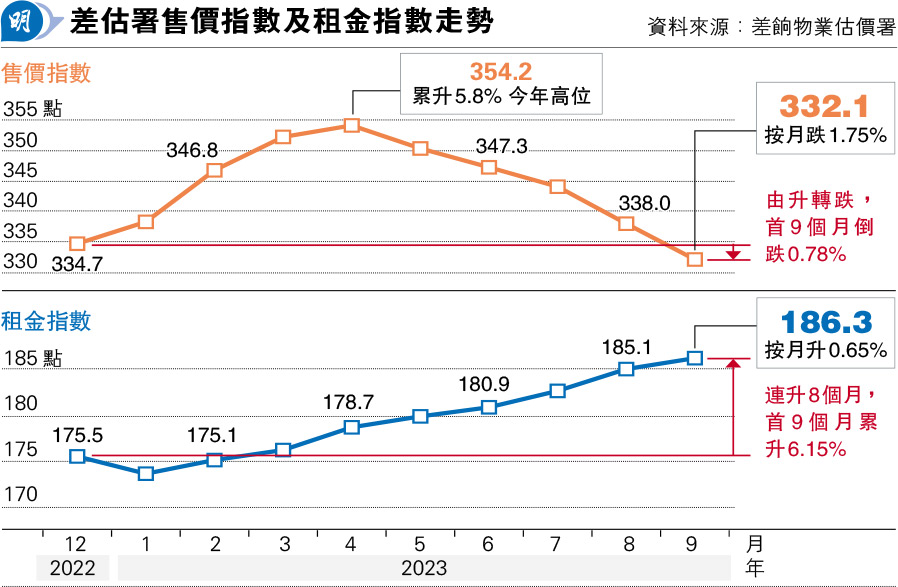 可留意是,9月售價指數為2017年4月錄得330點後,約6年半以來最低;相對2021年9月高峰398.1點,則下挫16.6%。
