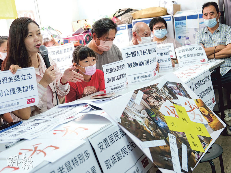 【明報專訊】《施政報告》提出設立「解決劏房問題工作組」,研究10個月為劏房居住環境設定最低標準等。社協昨日促請政府訂立完善執法及安置機制,建議先給予「劣質劏房」業主半年期限改善單位,並容許受影響住戶提前3年入住公屋,倘未能安排,應提供租金津貼。