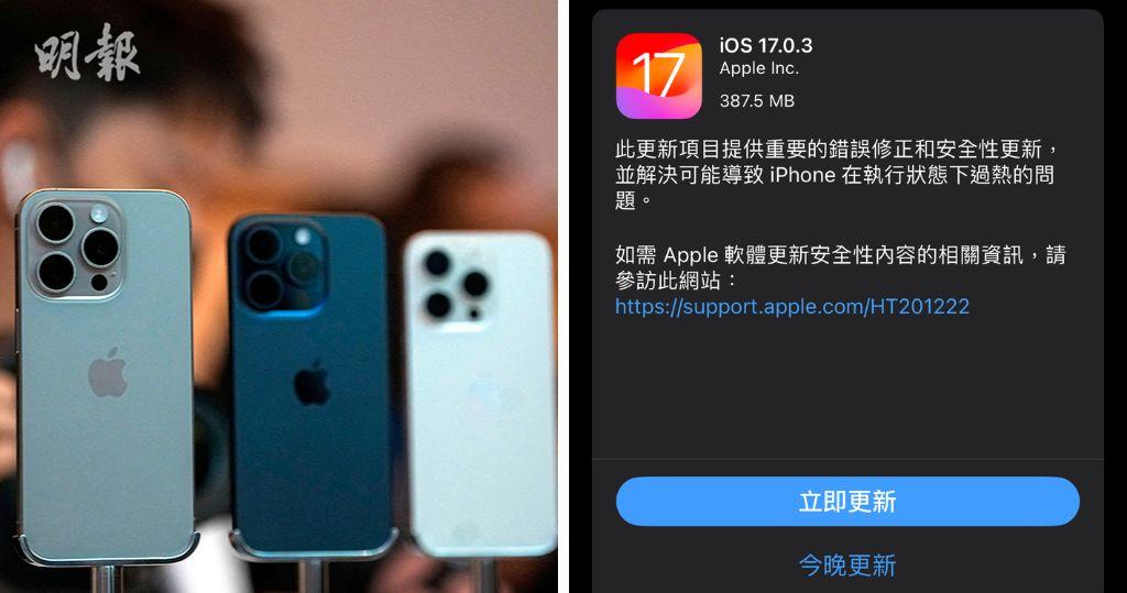 即時熱點 蘋果推iOS 17.0.3修復新機過熱問題 (10:54) 發佈於 2 年 前 2023 年 10 月 5 日 By 明報 蘋果推出iOS 17.0.3更新,內容包括修復導致iPhone 15系列新機過熱問題。根據蘋果網頁顯示,「更新提供了重要錯誤修正和保安更新項目,並解決了可能導致iPhone運作時溫度比預期高的問題」。 蘋果日前證實iOS 17系統出現漏洞,iOS 17軟件缺陷和第三方應用程式使系統超負荷。第三方應用程式近日亦推出更新以作修正。蘋果否認新機過熱問題與其首創的鈦金屬外殼與USB-C接口有關。(CNBC) 相關文章:編輯推介蘋果過熱 Up Next 小犬|防風措施、窗邊滲水急救法、打風後家居清潔貼士一文睇 (13:58) 不要錯過 諾貝爾化學獎 三科學家發現和合成量子點獲獎 (18:01) 繼續閱讀 贊助商 猜你喜歡 「千問」一周逾千萬下載 阿里績前股價急彈 騰訊上季經調整盈利升18% 勝預期 降全年資本開支指引 否認減緩AI投入 Google最強AI晶片 擬數周內上市 摩通:比特幣今年底有望見16.5萬美元 秋日防秋燥|蒸燉蘋果食、煲蘋果水飲可養生?中醫稱適合脾胃虛弱、燥咳者 宜飯前食免礙消化【附4食譜】 (13:07) 蘋果意見書力陳歐盟「數碼法」弊端