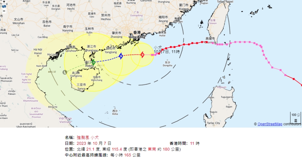 按照現時預測路徑,小犬將於明日(8日)日間在香港以南150公里內掠過。天文台屆時會視乎小犬的強度、移動速度,以及與其相關烈風區與香港的距離,評估是否需要發出更高的熱帶氣旋警告信號。預料本港明日及星期一(9日)有驟雨,雨勢有時頗大。