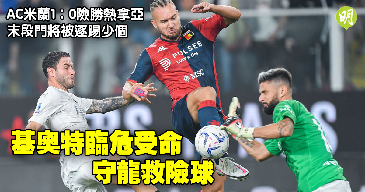 AC米蘭今晨(8日)在意甲作客「升班馬」熱拿亞,戰至補時階段因門將邁治蘭領紅兼換人名額已滿,最終37歲中鋒基奧特臨危受命串演把關,並成功化險為夷,助球隊險勝1:0,賽後8戰得21分,以兩分壓次席國際米蘭排榜首。
