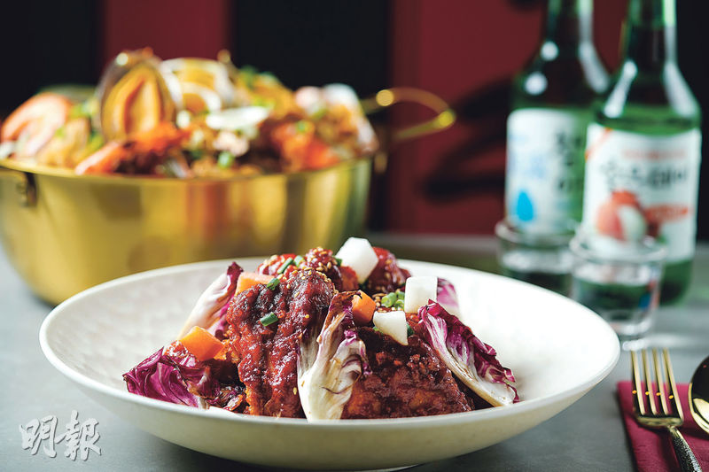 即使不大飲酒,也可試試多款下酒小食,都是在傳統韓食基礎上加入西方元素,更迎合香港人口味。比如「原生番茄、泡菜、布拉塔芝士」,荷蘭番茄配布袋芝士就經常吃到,今次加入辛奇之餘,還佐以紫蘇葉碎、芝麻油和羅勒油提香,吃時要將之撈勻,放在以糯米粉炸香的紫菜片上,一啖入口,辛奇的辣、芝士的香、番茄的酸加上各式調料,全部在嘴內綻放,百味紛陳。飲韓啤自然少不得配炸雞,重本以三黃鮮雞即點即做,先後經過兩次烤炸,配上以糖、醋、辣椒醬和醬油混調而成的特製醬汁,外皮酸甜香脆,雞肉香嫩爆汁,吃得出誠意十足。還有其他香口的小食,如炸紫蘇葉豬肉餃子、脆炸韓國豚魚乾……都是香脆可口的下酒菜,適合摸住酒杯底慢慢歎。
