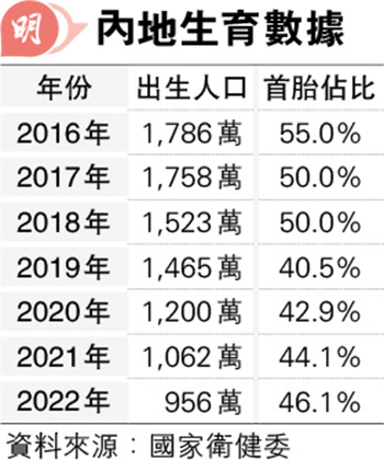 內地2016年推行「全面二孩」政策,2017年、2018年的二孩子出生數,均略多一孩出生數(大致相當)。到2019年起,愈來愈多新人不願生;當局把生育重任交付「老人」,2021年8月推出三孩生育政策。