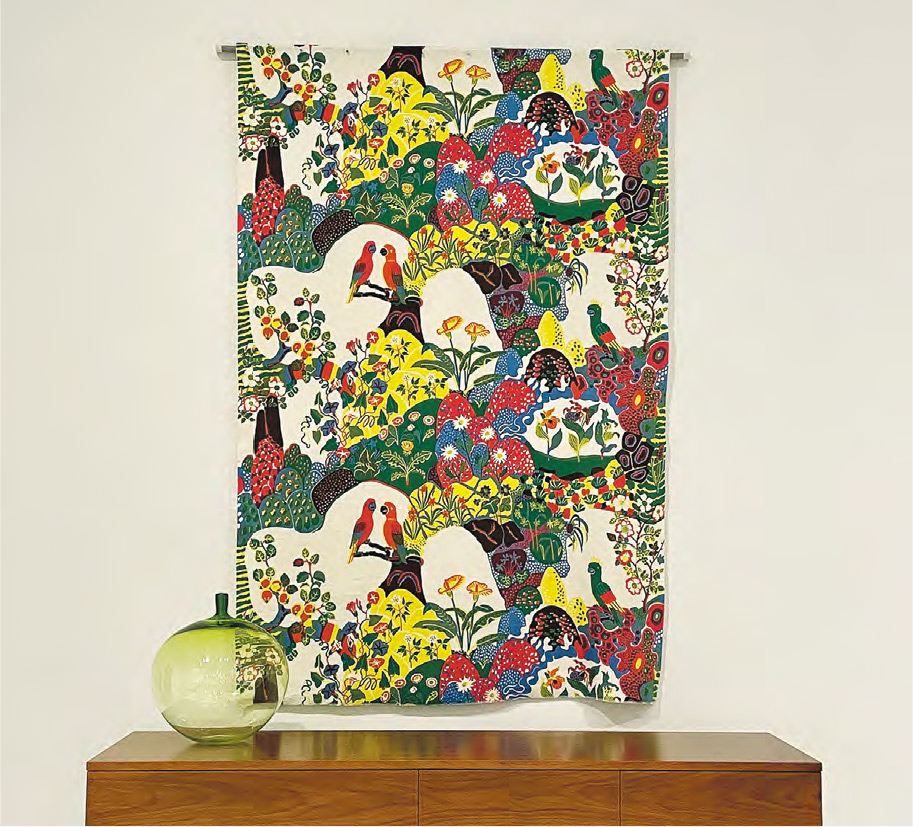 其中Josef Frank的設計讓人過目不忘。他是奧地利人,活躍在20世紀上半葉,一生設計了2000多件家具和160多款紡織品,這些作品現在仍可透過瑞典公司Svenskt Tenn買到。他的印花用色大膽,充滿大量花鳥和自然元素。幾個經典設計,例如Green Birds、Notturno、Vegetable Tree、蔬果、植物、鳥兒,特別是河流的設計,如迷宮般巧妙交錯,有種智力上的趣味。