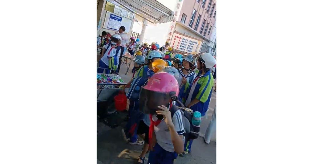 內地社交平台今天(4日)熱傳短片顯示,廣東湛江市徐聞縣角尾鄉中心小學要求所有學生戴頭盔上下課,有網民稱學生連行路、搭車也要戴頭盔,猜測學校要求統一購買頭盔,質疑背後存在利益輸送。