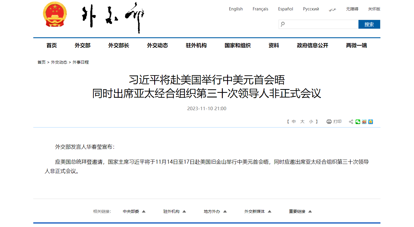 中國外交部發言人華春瑩今天(10日)晚間宣布,應美國總統拜登邀請,國家主席習近平將於11月14日至17日赴美國三藩市舉行中美元首會晤,同時應邀出席亞太經合組織(APEC)第30次領導人非正式會議。