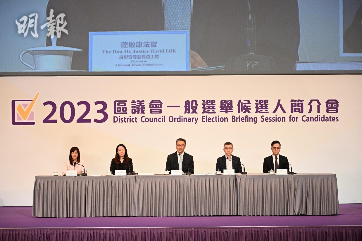 簡介會今日在灣仔伊利沙伯體育館舉行,由選管會主席陸啟康主持,300多名候選人或其代表出席。陸啟康表示,民政事務總署不准關愛隊以其名義支持任何候選人,候選人變相不可能獲得有關支持同意書,如候選人在選舉廣告提及關愛隊工作,予人感覺獲關愛隊支持,就可能違法。