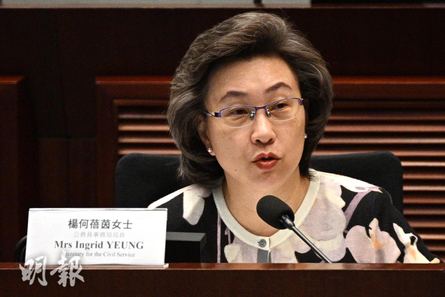 立法會議員郭偉强關注,29歲或以下的公務員人數有下降趨勢,僅佔公務員實際員額約12.8%,楊何蓓茵承認29歲或以下的公務員人數的確有所減少,但她稱與其他私營機構僱主都留意到,時下的年青人對學歷追求「大咗」,指現時年青人修畢學士學位後會選擇繼續修讀碩士或博士學位課程,認為此現象較以前普遍,故影響29歲或以下的公務員人數。