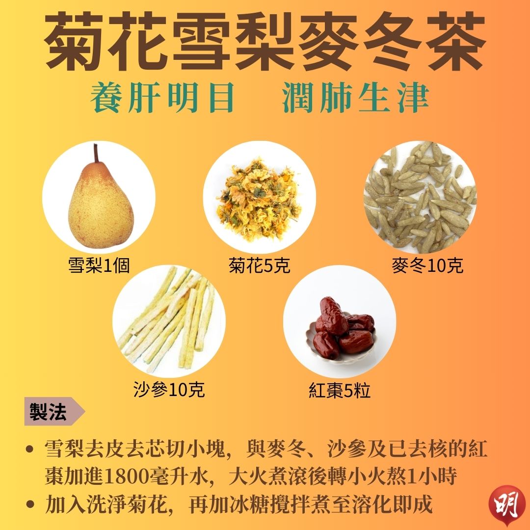 【宜忌】適合皮膚乾燥、喉嚨乾、眼乾人士;脾胃虛及濕氣較重人士,製作茶飲時可減去雪梨及菊花