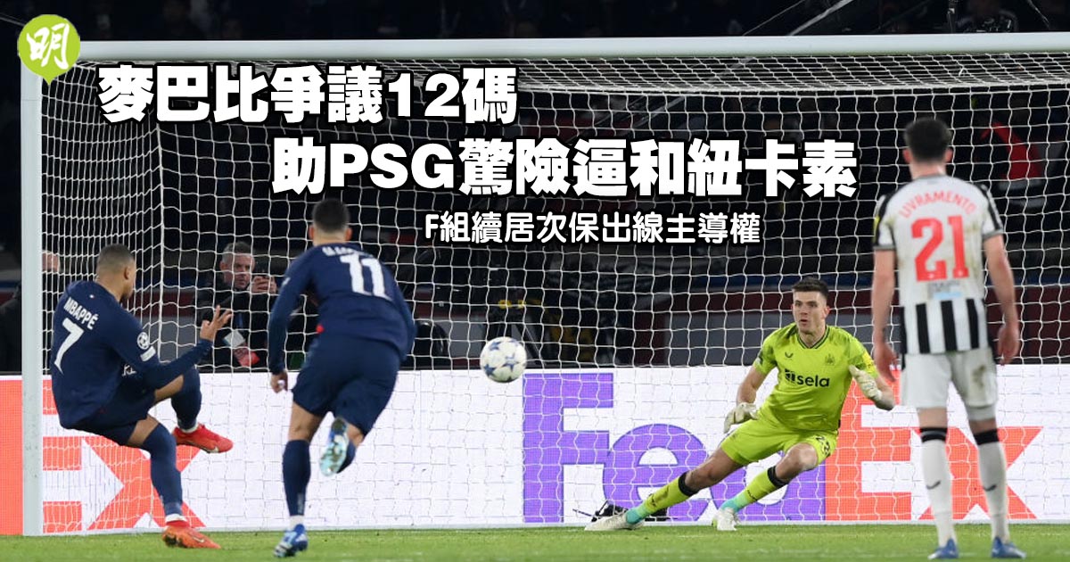 巴黎聖日耳門(PSG)今晨(29日)於歐聯F組關鍵戰,憑球星基利安麥巴比完場前補時射入一記爭議12碼,在主場以1:1驚險逼和紐卡素,得以續領先對方兩分保住次席,在下仗小組煞科擁有出線主導權。