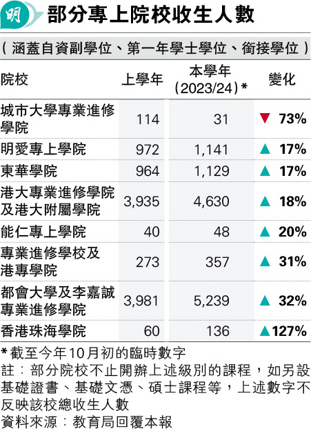 教育局提供的院校收生數據,涵蓋院校學士及副學位級別的收生人數,不包括基礎文憑、碩士課程等。其中城市大學專業進修學院(CityU SCOPE)在此3類課程的收生人數由114按年減83,至31人,跌幅73%,全部入讀銜接學位。翻查網頁,SCOPE早前公布本學年起停收「商業管理榮譽文學士」及「商業資訊科技榮譽理學士」新生。SCOPE亦有開辦其他專業文憑、證書等課程。