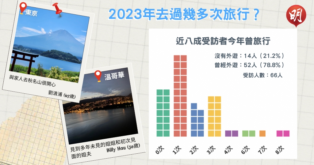 2023年港人終於可以再「飛」。隨着新冠疫情結束、各地放寬入境防疫措施,不少港人急不及待外遊。明報電子平台組較早前訪問逾60名市民,問他們今年有否去旅行及次數,近八成受訪者至少旅遊一次,其中兩人更去了8次(詳見內文旅行次數互動圖)。有受訪者表示,久違去旅行「興奮再飛」;有的「最緊要」與家人同遊……有重遊日本大阪心齋橋的市民感嘆,「變了許多,好多店舖消失了。」