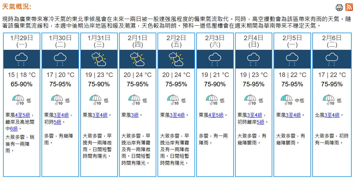 【18:30】本港地區今晚(28日)及明(29日)天氣預測:大致多雲,明早天氣清涼,市區最低氣溫約15°C,新界再低兩三度,日間最高氣溫約18°C,稍後有一兩陣雨。吹和緩至清勁東至東北風,明日離岸及高地間中吹強風。展望周二(30日)有幾陣雨。本周中後期和暖及潮濕,日間天色明朗。(天文台)