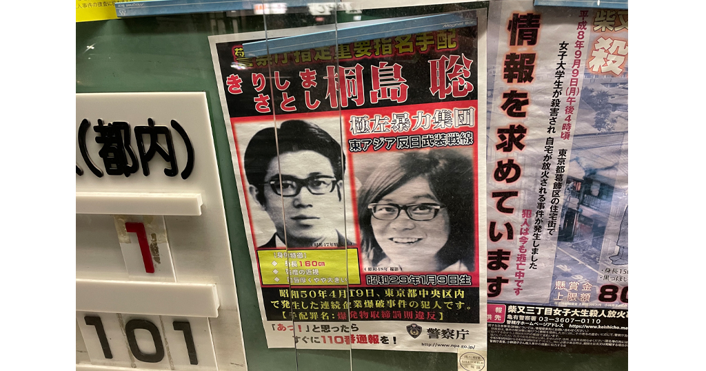 桐島聰是激進組織「東亞反日武裝戰線」的成員,涉嫌於1975年4月在東京銀座的韓國產業經濟研究所放置及引爆土製炸彈,翌月起被警方通緝。桐島聰是日本通緝犯中潛逃時間最長的人,被通緝49年,其通緝海報經常在日本街頭或車站見到。(共同社/NHK)
