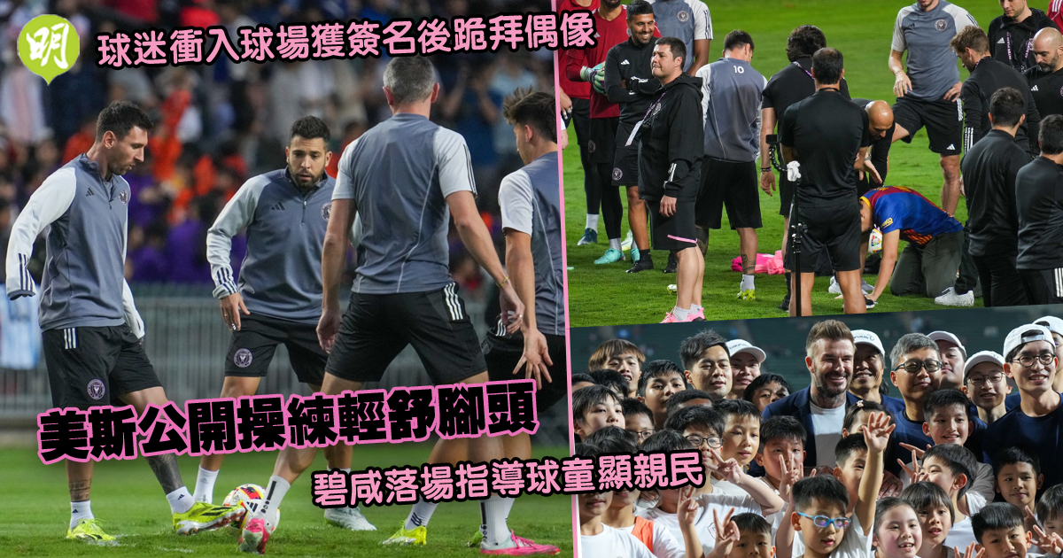 美斯相隔近10年重臨香港大球場!這名阿根廷球王今午(3日)率領美職球會國際邁阿密球員參與公開操練,吸引多達39,916名球迷入場一睹球王風采,但美斯期間僅輕舒腳頭,明午表演賽能否正選成疑。此外,操練期間先後有數名球迷衝入球場嘗試接觸球星,當中有一名球迷成功突圍取得美斯簽名後,更即場跪拜偶像。雖然大部分球員操練後隨即離場,未有留步為場邊觀眾簽名合照。不過班主之一「萬人迷」碧咸現身觀操之餘,更在尾聲「腳痕」落場指導學童兼大合照,盡顯「暖男」親民一面。