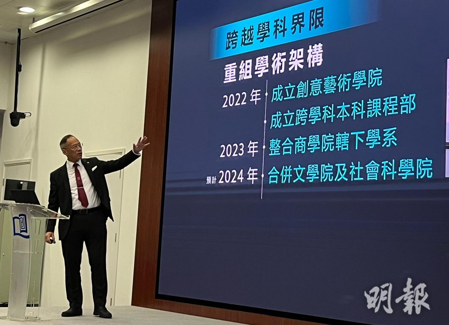 浸大教務議會上月通過合併文學院和社會科學院,浸大校長衞炳江透露,校董會下月將處理合併方案。近月學生關注組曾委託民研做調查,逾八成半受訪者(612人)反對合併計劃,有學生曾在校外默站反對。社科院長黎永亮說,當大學推動改革時,若沒人有意見「唔係好正常」,但形容學生和校友「都冇好大嘅反對聲音」。