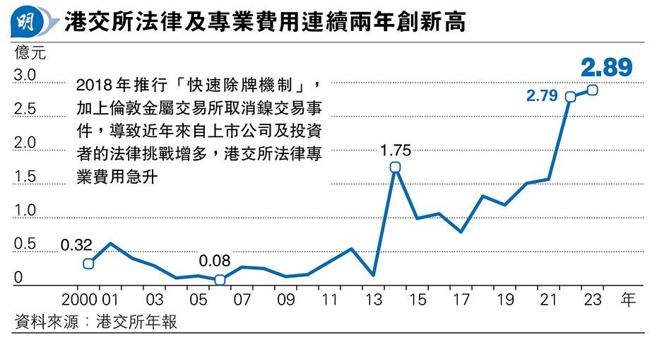 【明報專訊】港交所(0388)上市科一日內面對兩項法律挑戰,所牽涉的法律訴訟費用自然不菲。翻查港交所年報,自近年落實「快速除牌機制」後,「法律及專業費用」成本自2019年起已連續4年上升,並於2022及23連續兩個年度創新高(見圖)。