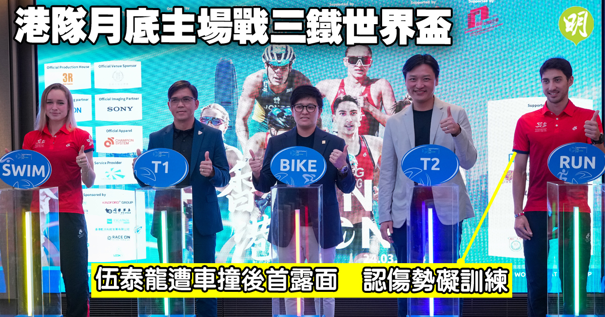 三項鐵人世界盃香港站將將本月24日上演,港隊昨假灣仔舉行記者會,分享備戰情况,上周三在沙頭角公路騎單車訓練時,遭雙層巴士撞到的杭州亞運混合接力賽銅牌得主伍泰龍亦有現身,他坦承傷勢影響訓練,但仍會保持樂觀,享受爭取巴黎奧運資格的過程。