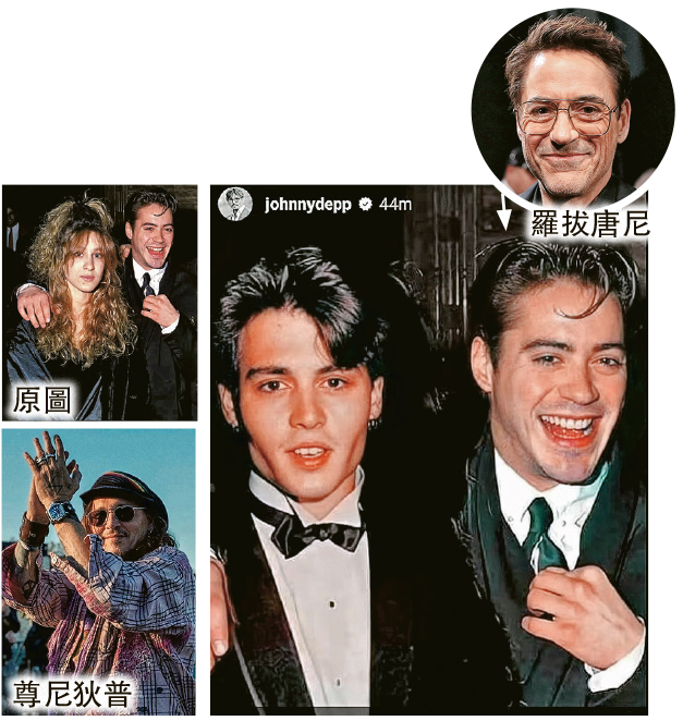 【明報專訊】「鐵甲奇俠」羅拔唐尼(Robert Downey Jr.)出道多年,終憑《奧本海默》首奪奧斯卡最佳男配角,跟他相識多年的《魔盜王》尊尼狄普(Johnny Depp)隨即透過社交媒體Ig Story上載二人年輕時代的合照,雖然沒有寫下片言隻字,但粉絲都能心神領會。不過,有眼利網民發現這張照片實屬電腦後期加工的「P圖」,原圖來自1998年羅拔唐尼與時任女友兼《色慾都市》主角莎拉謝茜嘉柏加(Sarah Jessica Parker)合照,根本與尊尼狄普無關,結果成為笑柄。