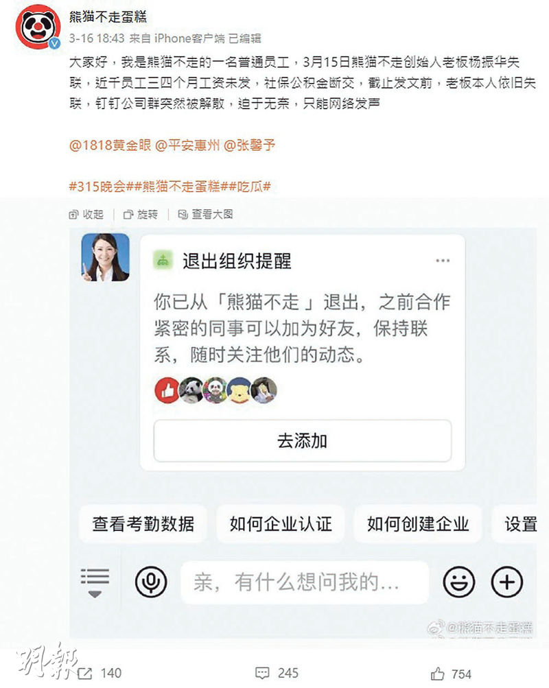 【明報專訊】在全國24座城市設有中央廚房的網紅蛋糕店「熊貓不走蛋糕」突然倒閉。創始人楊振華在失聯前曾在工作群向員工道歉,稱由於管理決策和疫情等原因,其未能把公司救回來。目前傾盡所有無力償還債務,會接受法院公安處理。